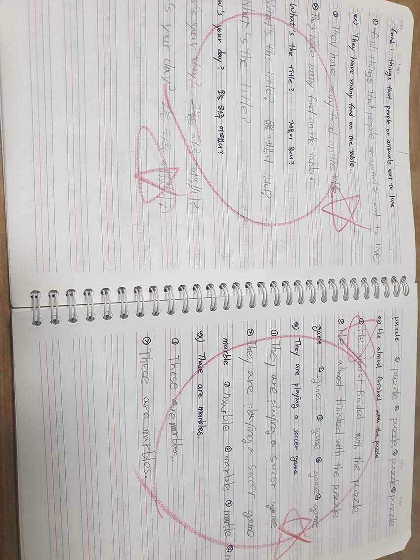 소윤이는 벌써 8월부터 선생님이 내어주시는 단어 숙제를 이렇게 열심히 노트에 적어가며 읽고 쓰고 있습니다. 프리토킹이.. 쉽진 않겠지만, Christopher 선생님과 함께라면 이 영어 수업을 즐겁게 계속 해나갈거라고 생각합니다.