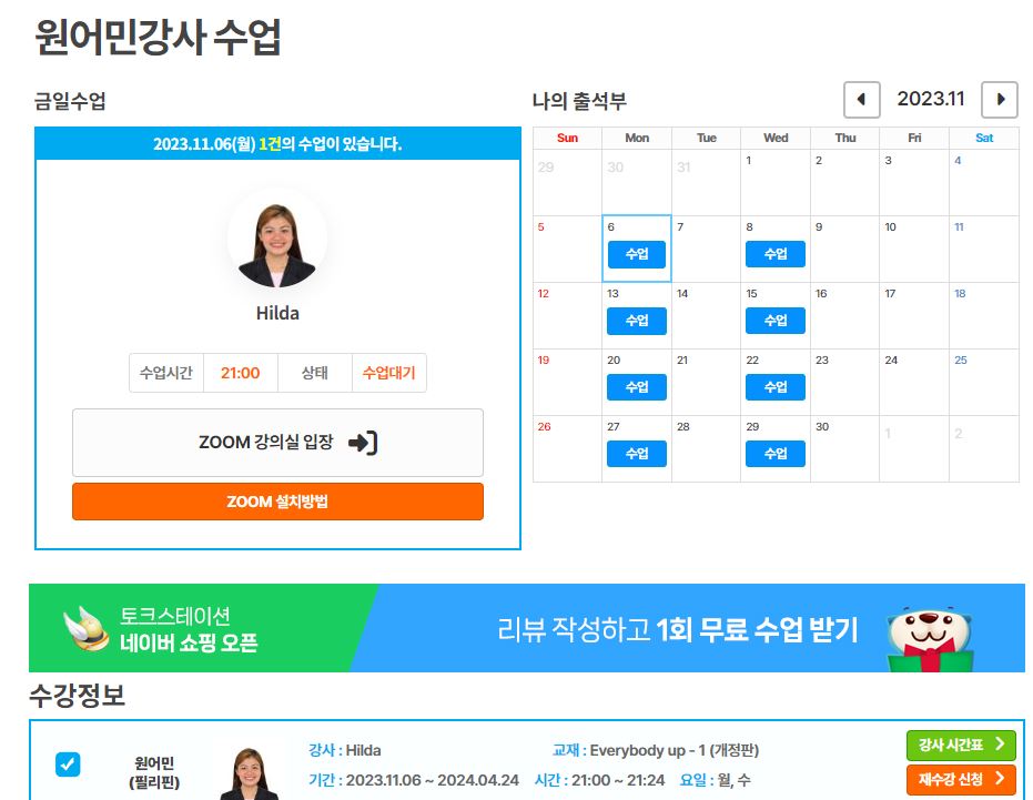 즐겁게 수업을 하고 있습니다. 수업이 부담이 되거나 스트레스를 받지 않고 네스 선생님하고 편안하게