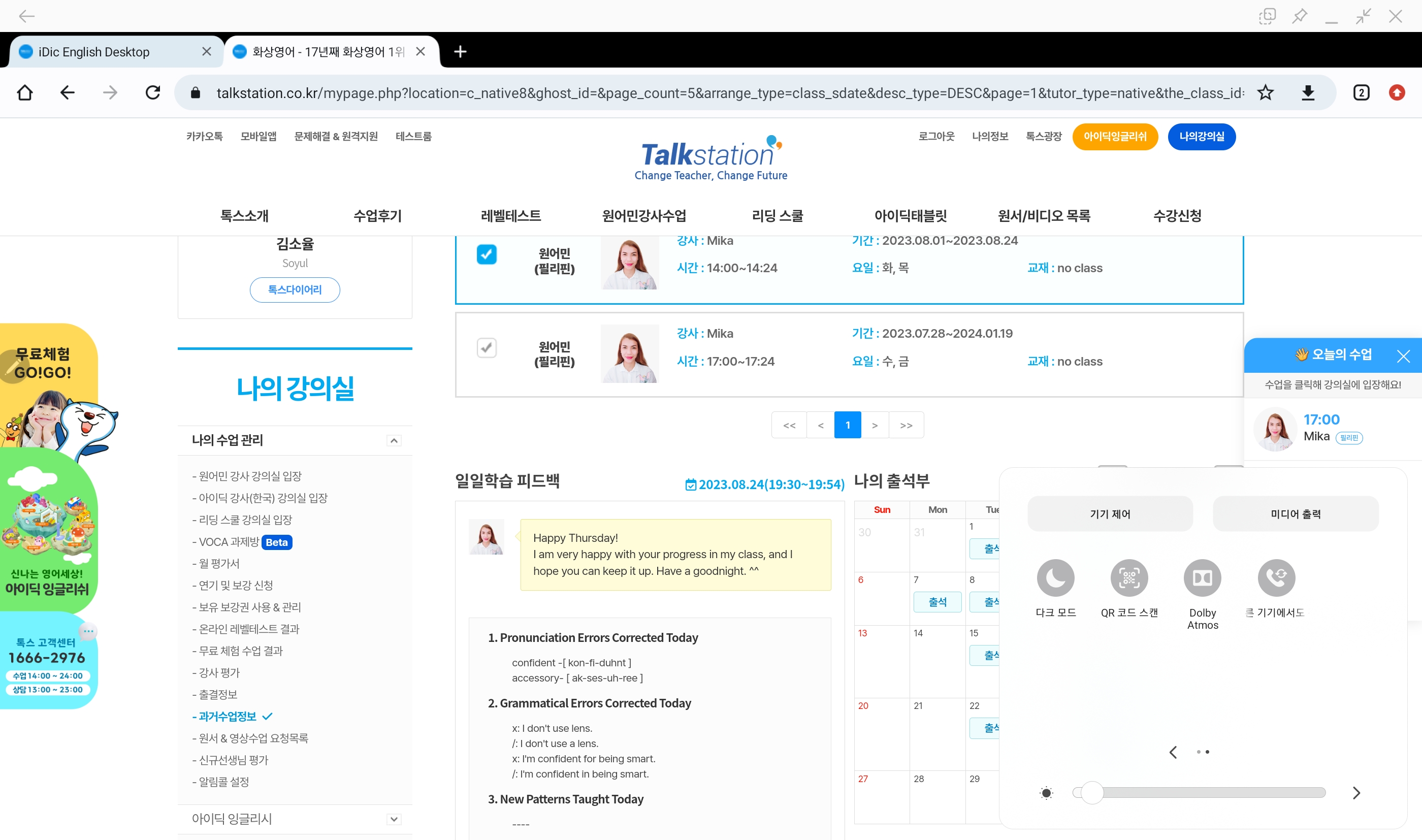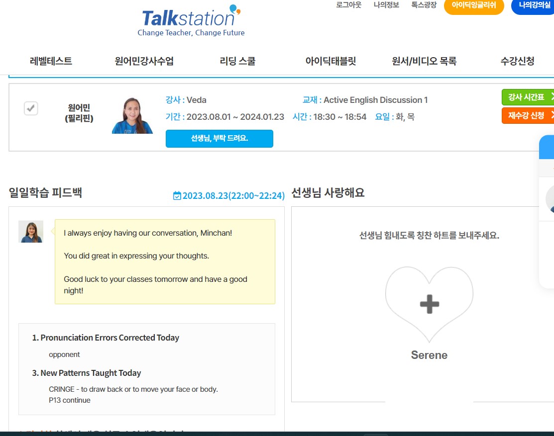 토크스테이션이 선생님 관리도 잘 하는 것 같고 수업끝나고 있는 과제방도 잘 되어있고 매시간 올려주시는 피드백도 좋고 여러모로 만족합니다~