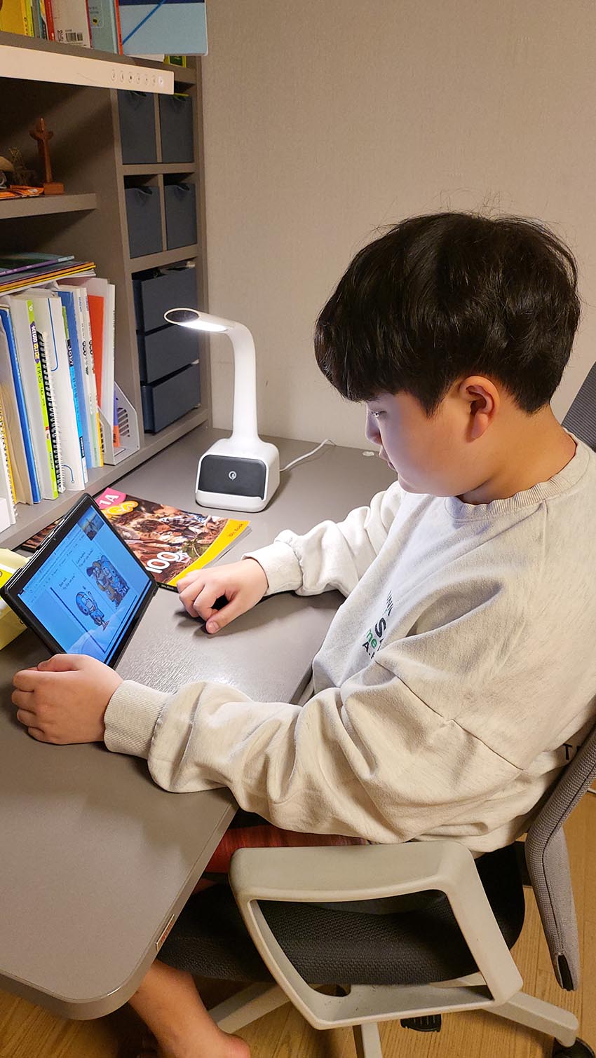 아이가 수업 시간을 기다리며, 즐겁게 수업에 참여하고 있습니다.