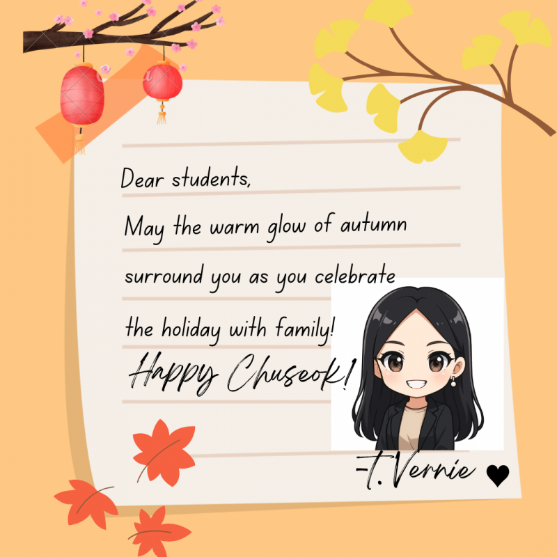 Dear Students, Happy Chuseok! I hope you enjoy this special holiday with your family and loved on